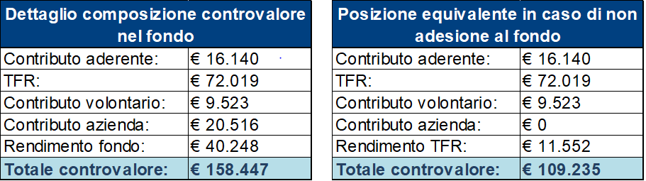 Il confronto fra il primo iscritto e il suo ipotetico gemello che ha deciso di non iscriversi è quindi particolarmente significativo e mostra come, in un’ottica di lungo periodo, l’investimento del fondo pensione sia sinora riuscito ad assolvere al suo compito istituzionale di accrescere il capitale degli associati in vista della pensione.