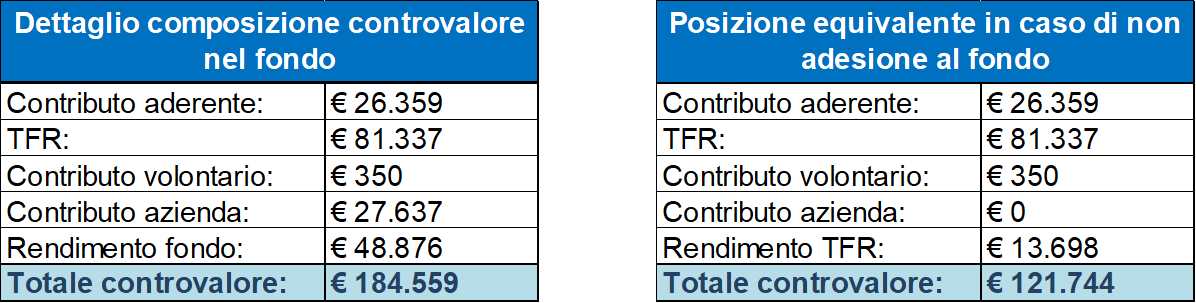 Il confronto fra il primo iscritto e il suo ipotetico gemello che ha deciso di non iscriversi è quindi particolarmente significativo e mostra come, in un’ottica di lungo periodo, l’investimento del fondo pensione sia sinora riuscito ad assolvere al suo compito istituzionale di accrescere il capitale degli associati in vista della pensione.