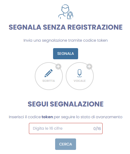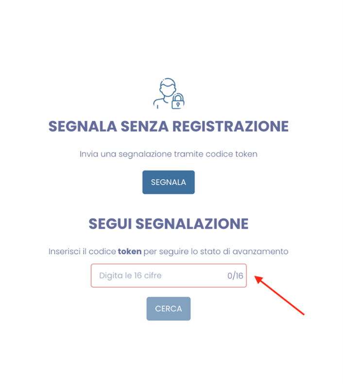 3. Una volta inviata la segnalazione, l'applicativo genererà un codice token univoco di 16 cifre collegato alla segnalazione specifica, da salvare e conservare con cura in quanto senza tale codice non sarà più possibile accedere alla propria segnalazione e visionare i cambi di stato, ovvero la messaggistica inserita dal gestore del canale di segnalazione. Per rientrare nella segnalazione è infatti necessario inserire il codice nella sezione specifica:
