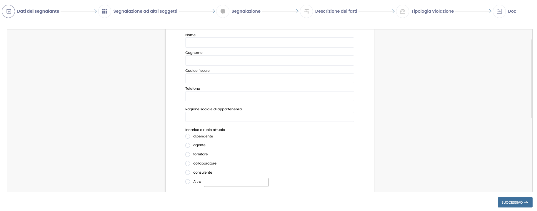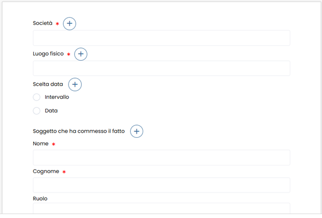 2. Nel caso si opti per la segnalazione scritta, ha inizio la compilazione del form di segnalazione, dove è possibile inserire una serie di informazioni. Le informazioni riguardanti i dati del segnalante sono tutte facoltative, quindi è possibile scegliere di compilarle oppure procedere in totale anonimato.