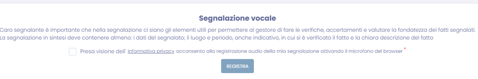 Il segnalante deve attivare il registratore interno all'applicazione e memorizzare un messaggio vocale della durata massima di 5 minuti; è possibile attivare una funzione che consente di alterare la propria voce in modo da renderla irriconoscibile.
