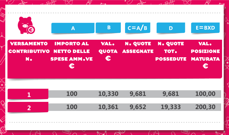 Dal contributo mensile di ogni aderente vengono sottratti € 2 (per un totale di € 24 all’anno) a copertura delle spese amministrative, il restante (contributo mensile – € 2) viene utilizzato per sottoscrivere nuove quote al valore corrente.